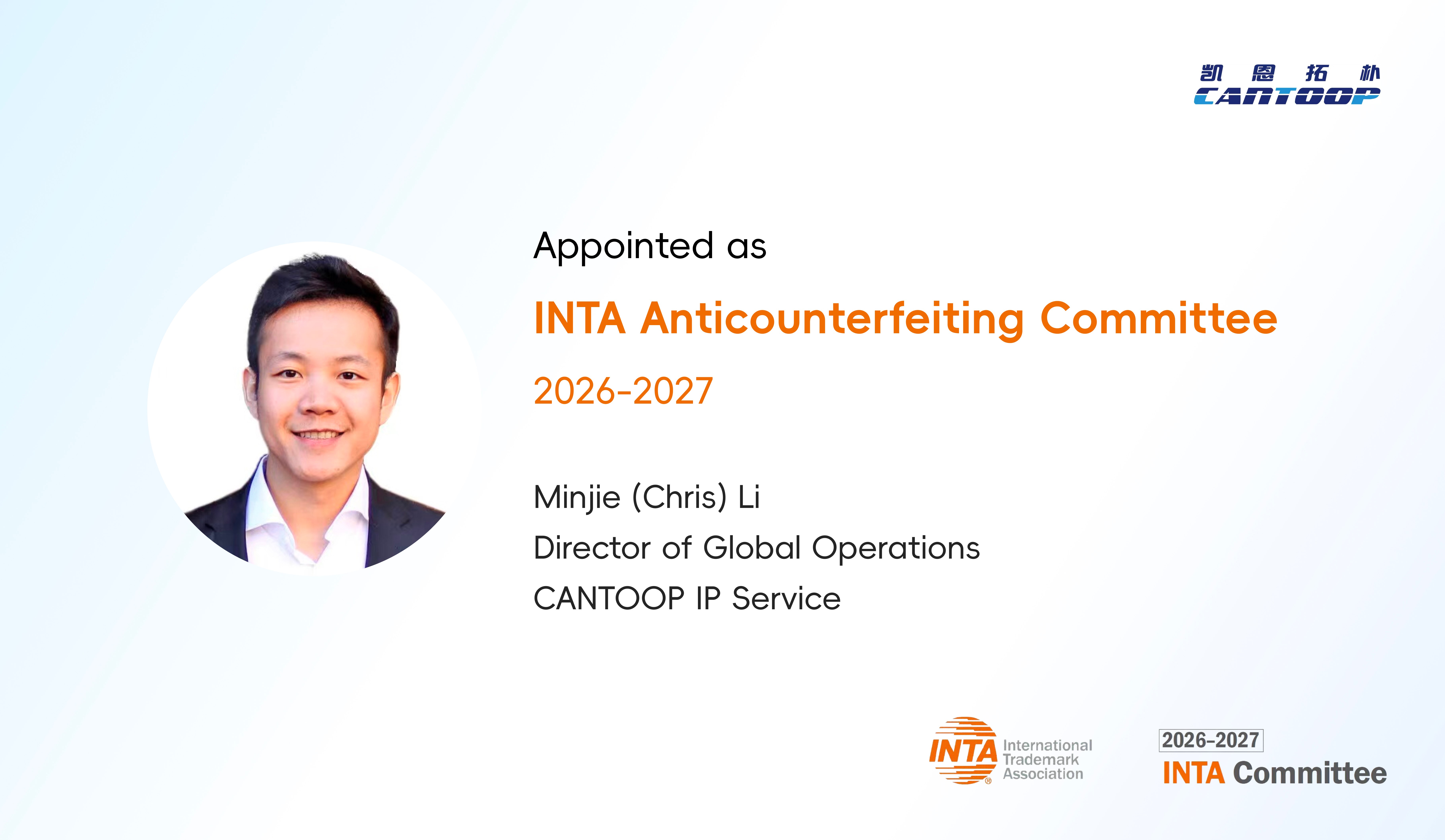 CANTOOP IP Service (Shanghai) Co., Ltd.는회사의 국제 운영 이사인Chris Li가2026-2027년 임기의국제 상표 협회(INTA) 위조 방지 위원회위원으로 공식 임명되었음을 발표하게 된 것을 기쁘게 생각합니다.